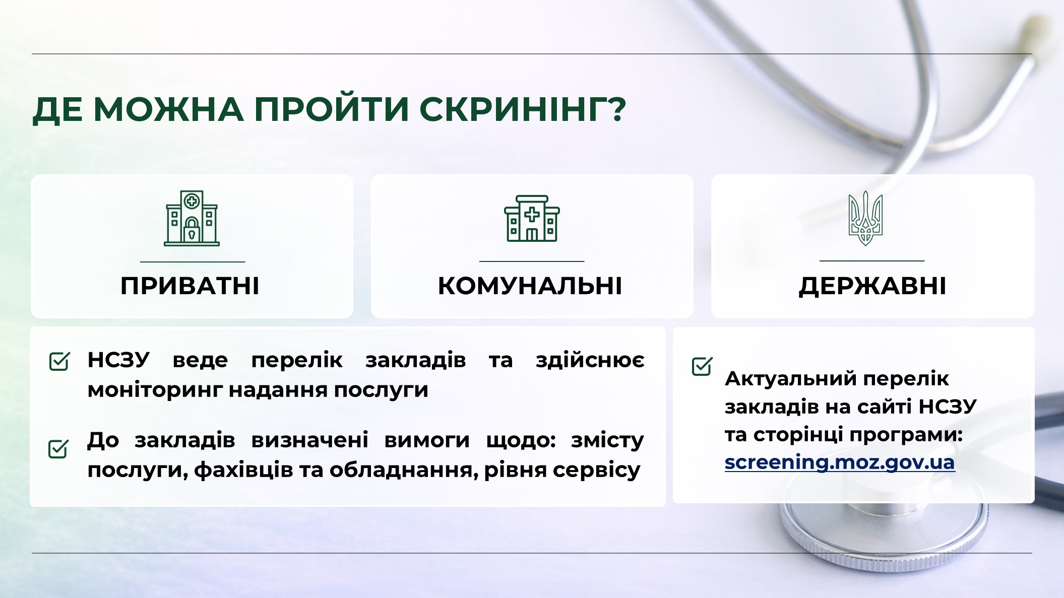 Відповіді на поширені запитання: https://screening.moz.gov.ua