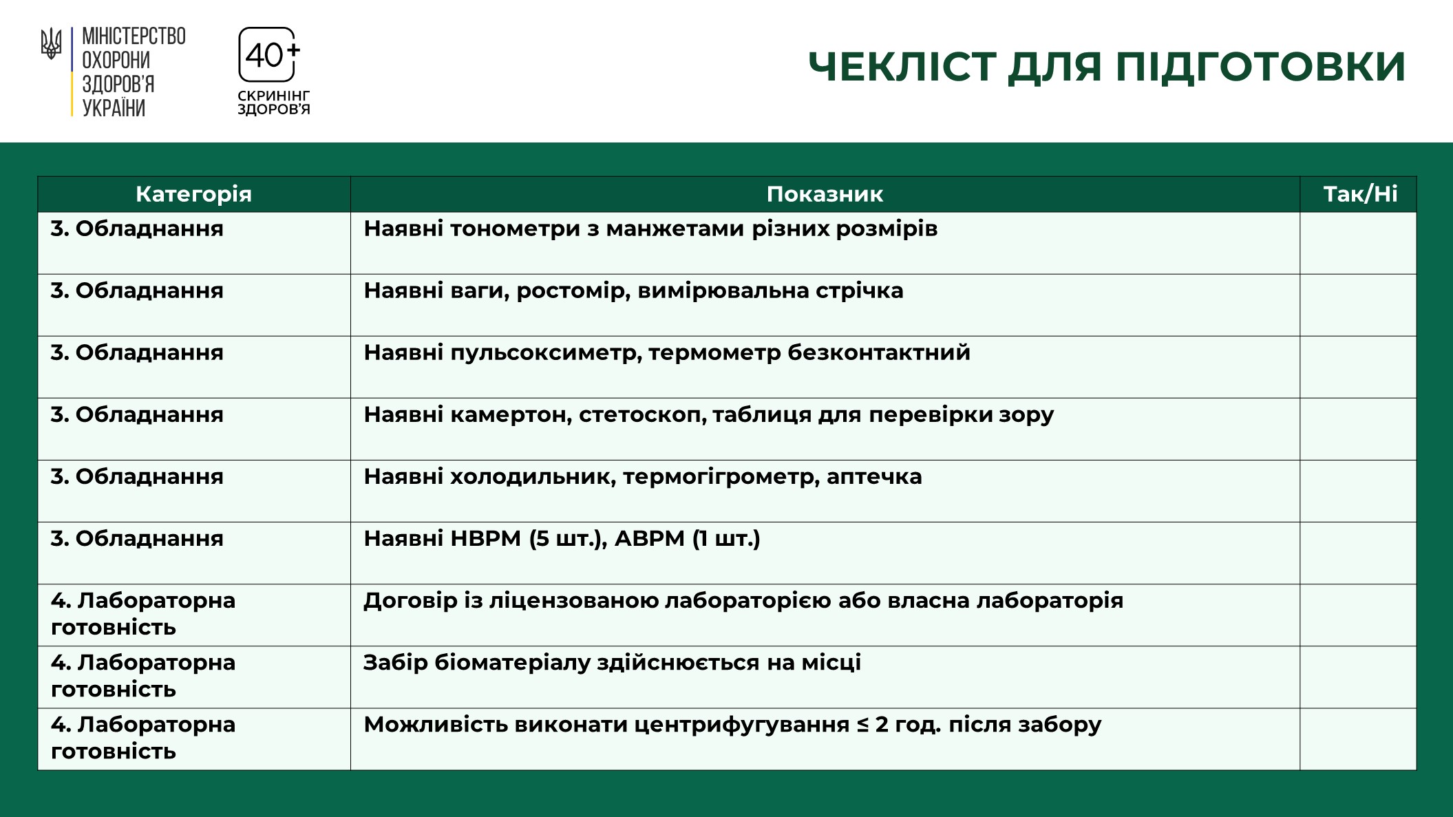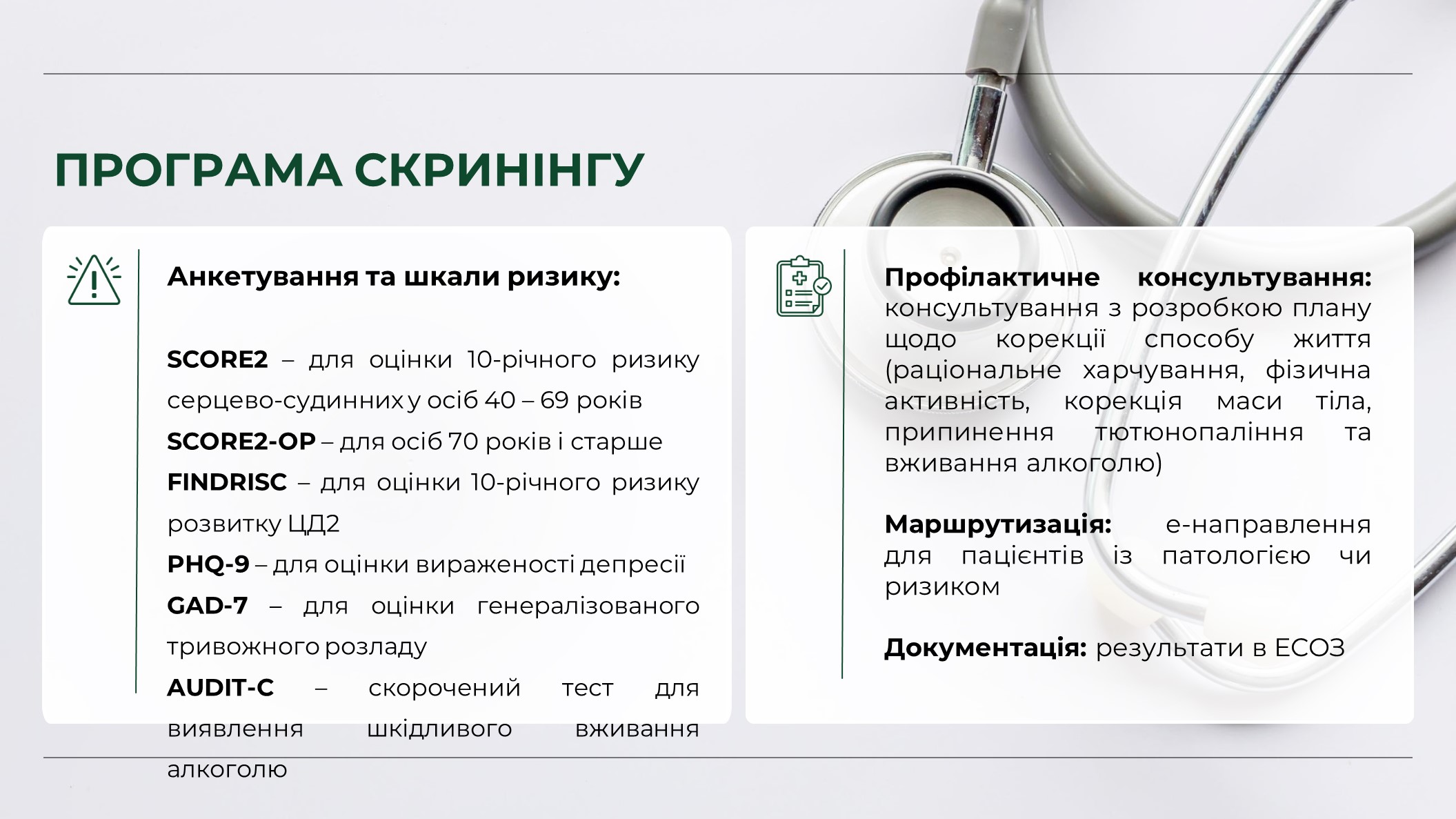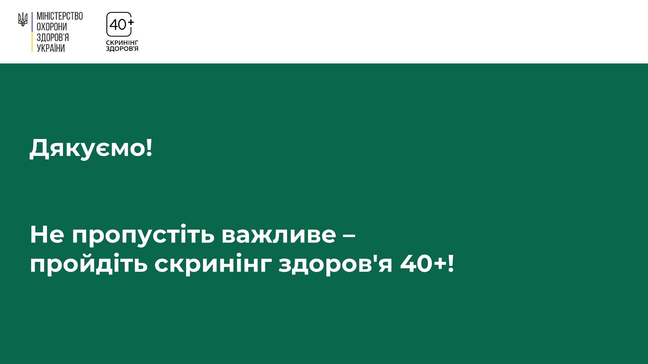 1 січня 2026 року Міністерство охорони здоров’я України спільно з партнерами запустили програму Скринінг здоров’я 40+. Вона орієнтована на людей від 40 років і старше. Та передбачає раннє виявлення серцево-судинних захворювань, цукрового діабету і проблем психічного здоровʼя.