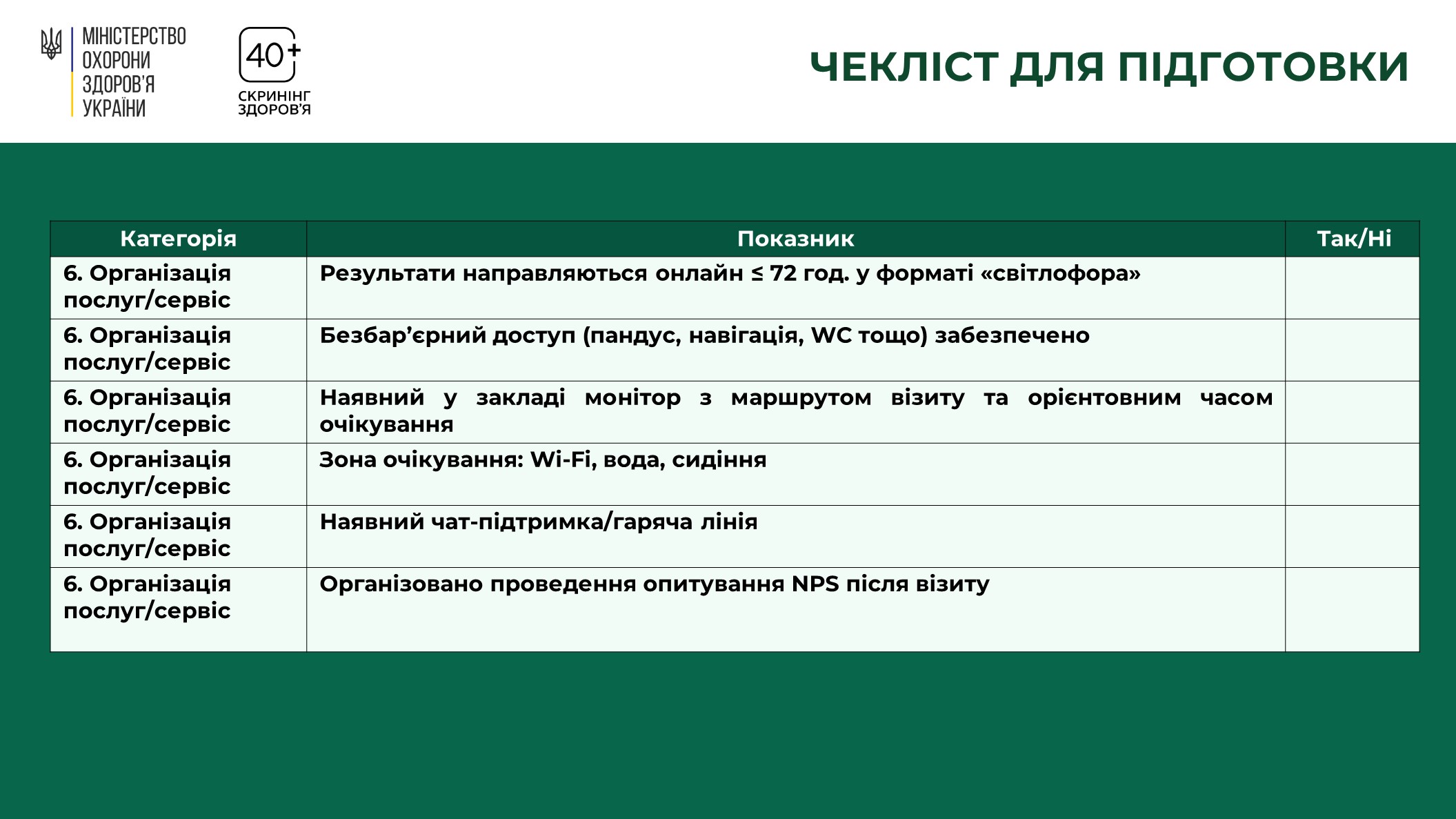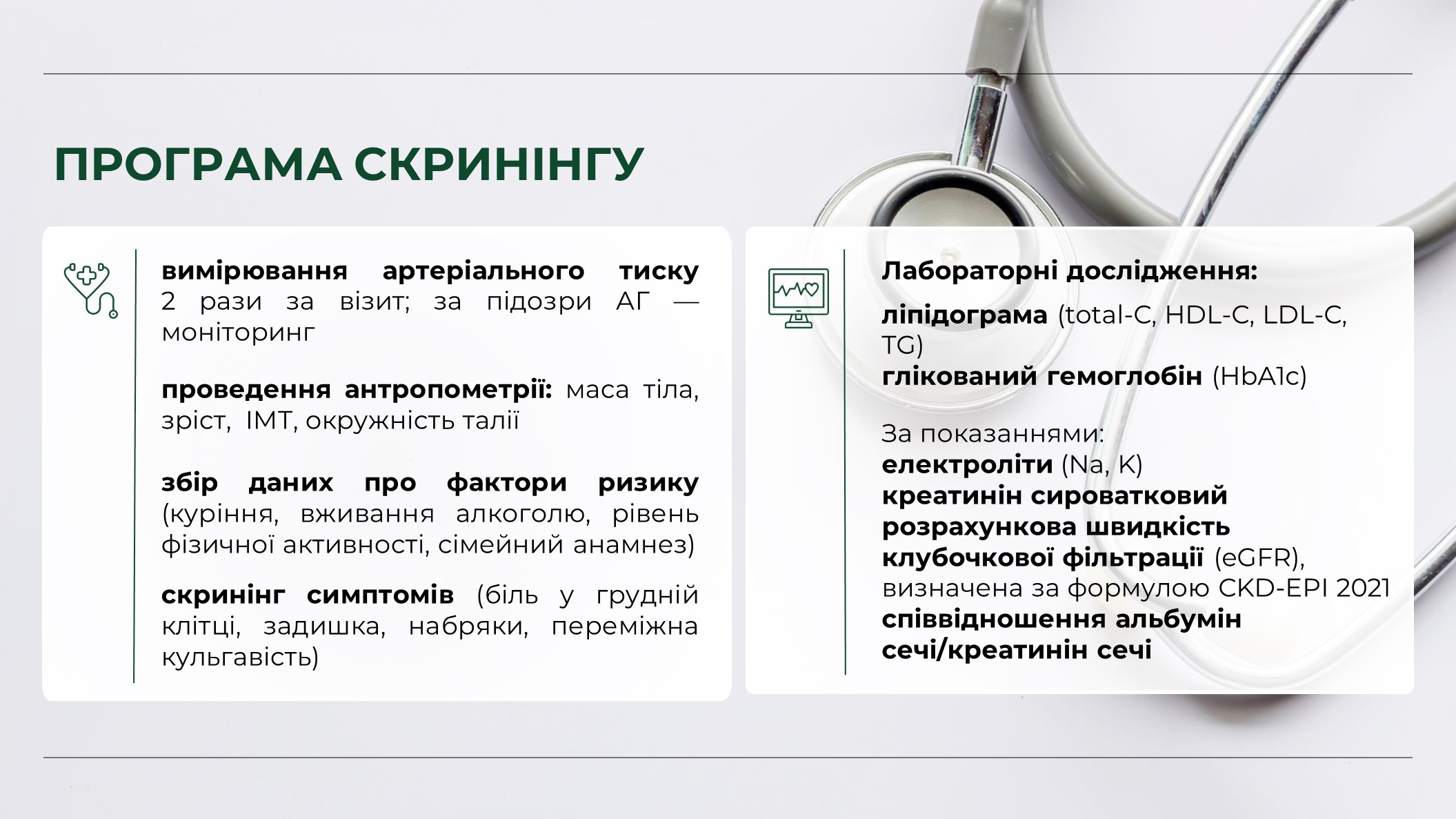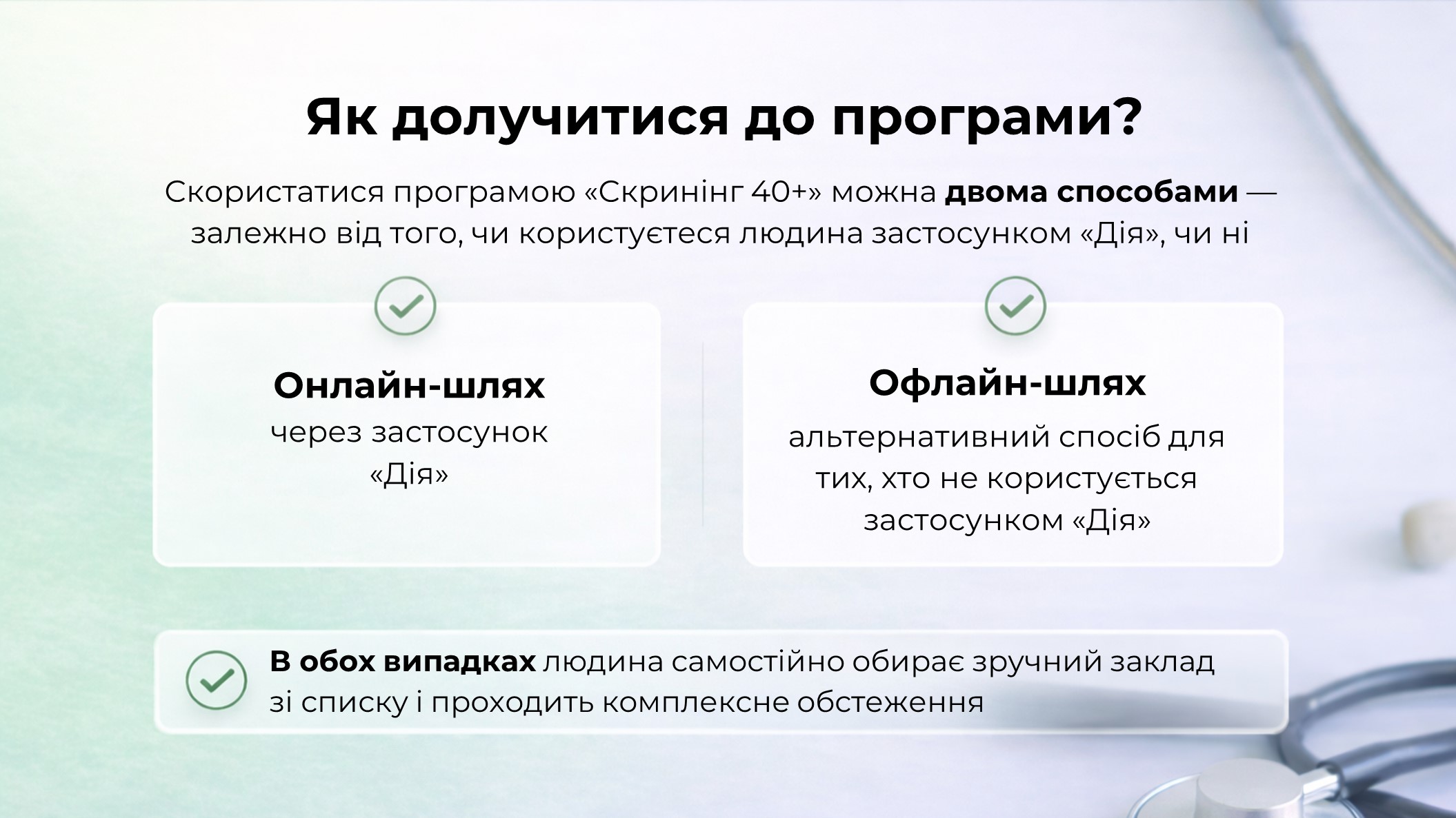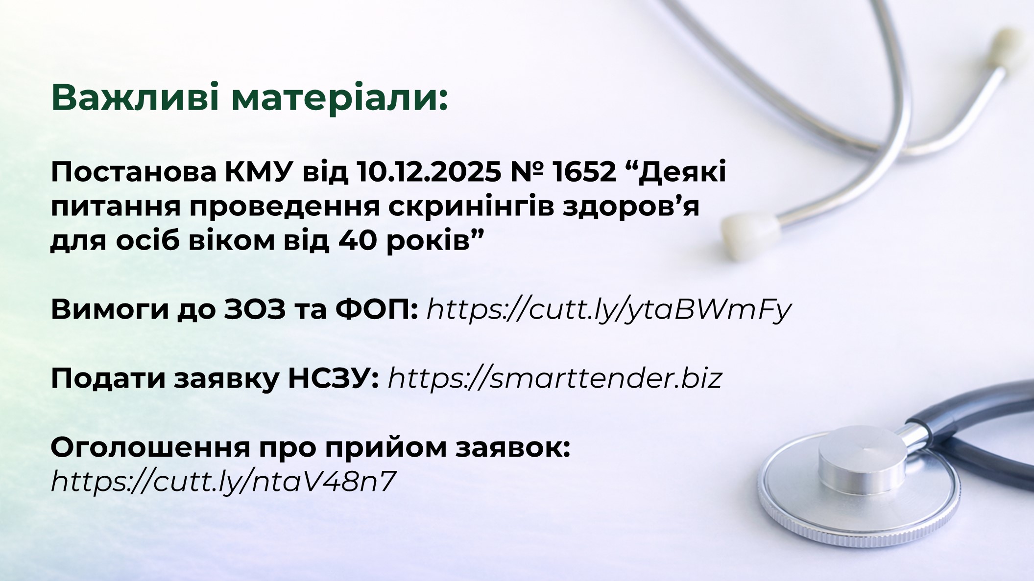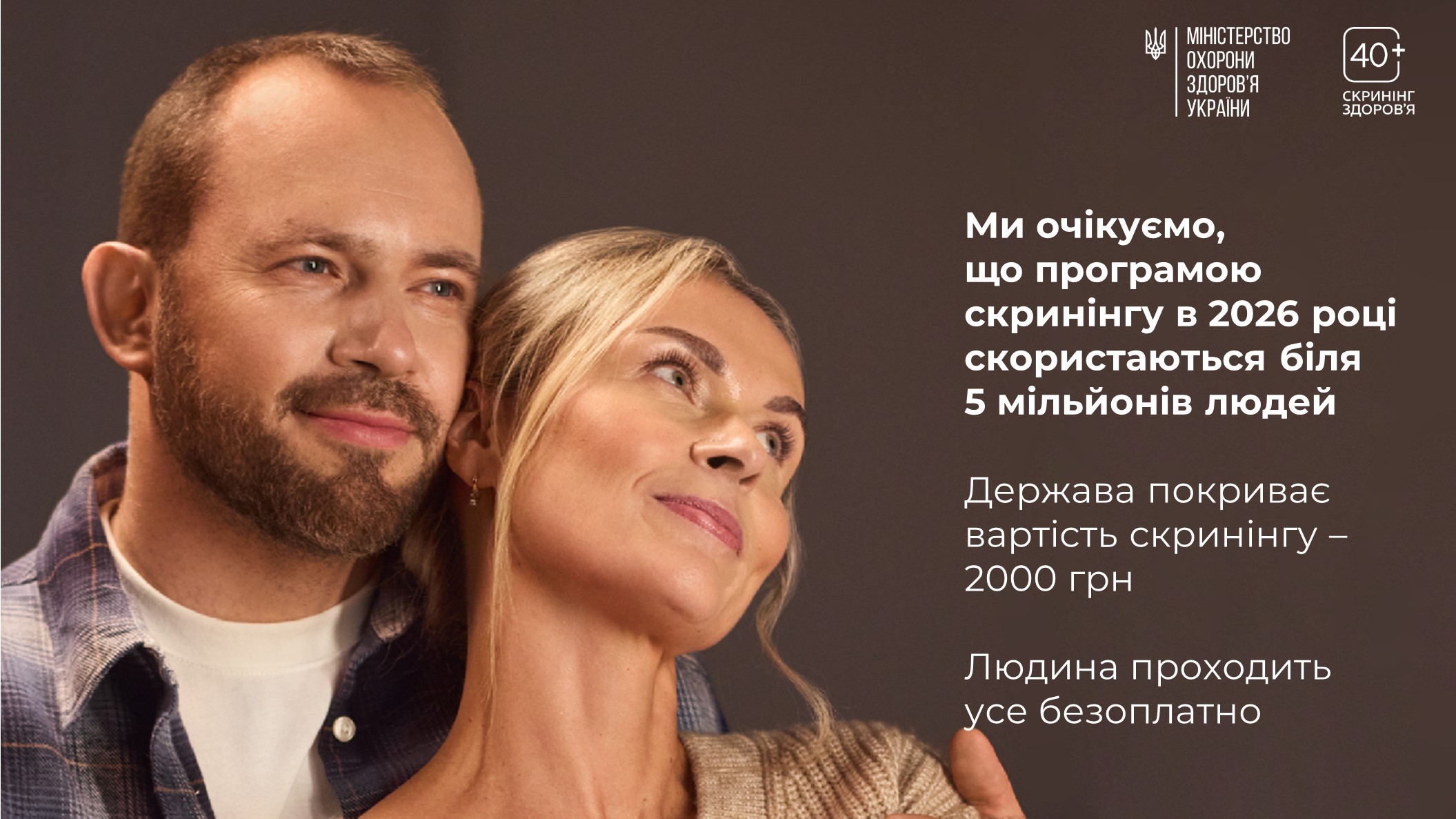 1 січня 2026 року Міністерство охорони здоров’я України спільно з партнерами запустили програму Скринінг здоров’я 40+. Вона орієнтована на людей від 40 років і старше. Та передбачає раннє виявлення серцево-судинних захворювань, цукрового діабету і проблем психічного здоровʼя.